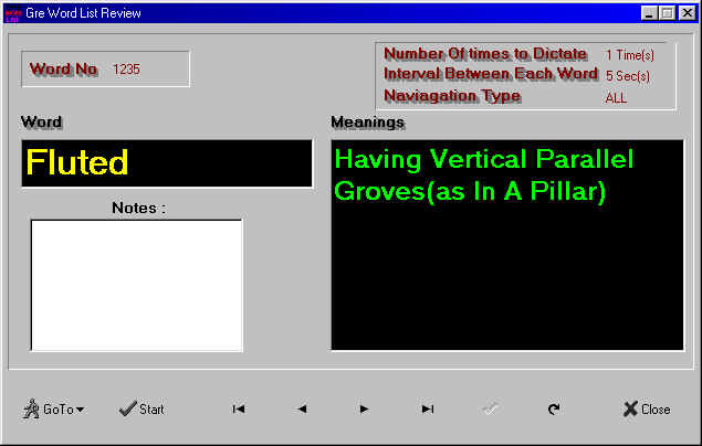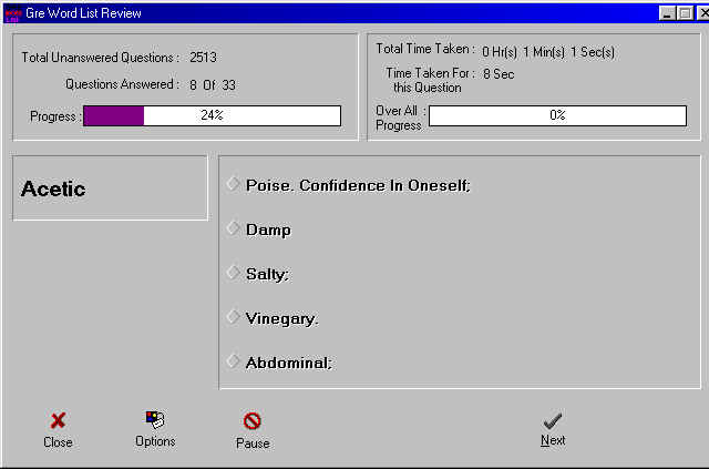 The most anticipated version 0.2 was released on 07/07/2001 after reviewing valuables suggestions made by dedicated GRE Word List Reviewer users. Many bugs were fixed and new features have been introduced. Please refer the Features section for a complete overview of the tool